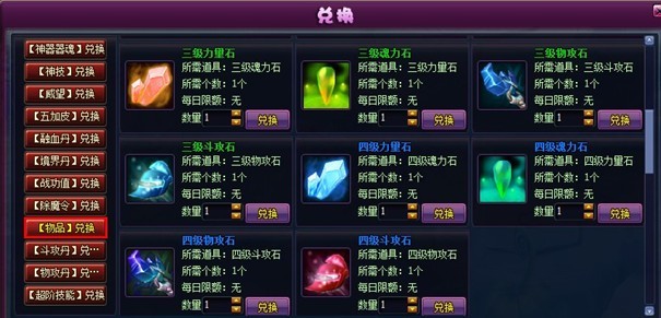 4、 【兑换商城】--【物品】兑换栏新增三级攻击类宝石互相兑换、四级攻击类宝石互相兑换功能(攻击类宝石:魂力石、力量石、斗攻石、物攻石)。