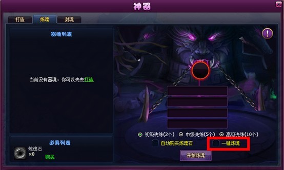 4. vip10以上新增一键炼魂功能,点击一键炼魂后会将器魂所有属性提升到最接近的颜色,依次为白,绿,蓝,紫,橙