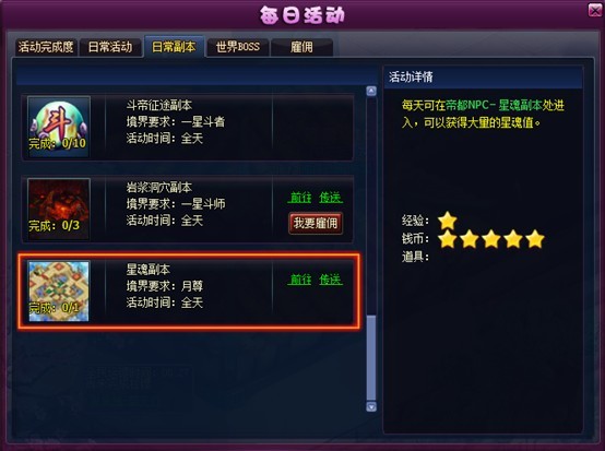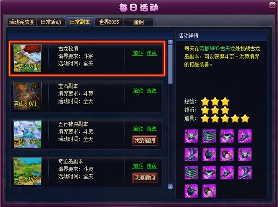 5. 活动面板日常副本新增古龙秘境,星魂副本。