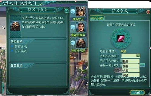 每四个低级符石可以在“试炼之门-符石补天匠”处合成一个高等级符石,合成100%成功。