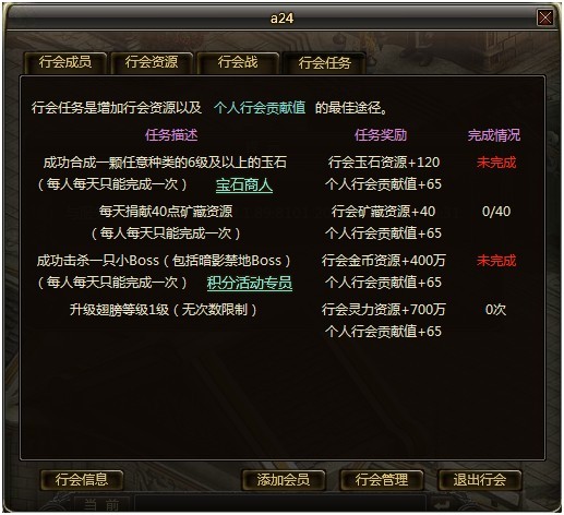 每天有4个任务可以增加行会资源及个人行会贡献值,行会资源可以用于升级行会,个人行会贡献值可以用于学习行会技能。