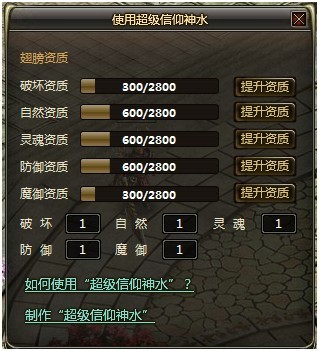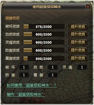 超级信仰神水:来自东方的炼丹圣物,不仅需要各种珍稀的药材,使用后更能以最好的效果大幅提升“双翼天翅”的资质。