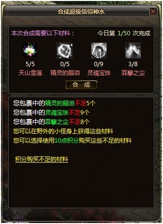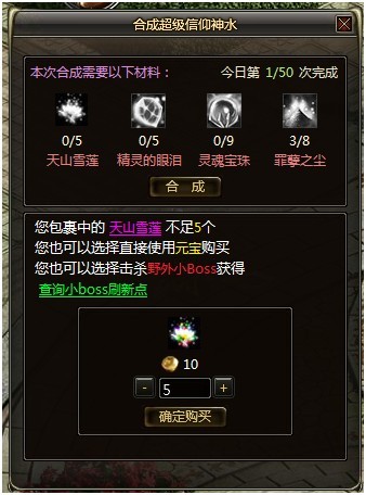 PS:超级信仰神水的材料——天山雪莲,野外小BOSS有50%的几率掉落,商城同样有售,仅售10元宝一个。