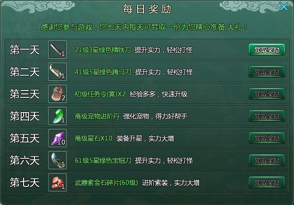玩家只要上线就能立即获得“新手福袋”!同时当角色的等级达到10级,20级,25级,30级,35级,40级,45级,50级,55级,60级时还 能分别获得一个“福袋”。只要打开就可获得超值道具奖励,包括绑银,高级药水,经验珠,任务令,额外背包,升星道具,马匹铠甲,宠物进阶丹,极品绿色装备 等!