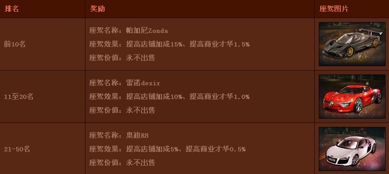活动内容:截止到2011年12月2日15:00等级排名前50的玩家,将会获得稀有座驾奖励。