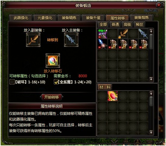 注:转移的属性不能超过该装备的最大属性,且不能对超过自己穿戴等级的装备进行操作。