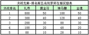 1、决战龙殿排名前五的战将玩家,可以为玩家所在服的其他所有玩家(等级在70级以上玩家)带来丰厚的奖励。奖励内容,根据排名来定,请参照下列活动奖励表。