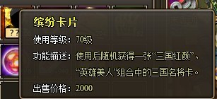 使用缤纷卡片后可随机获得一张“三国红颜”、“英雄美人”组合中的三国名将卡。