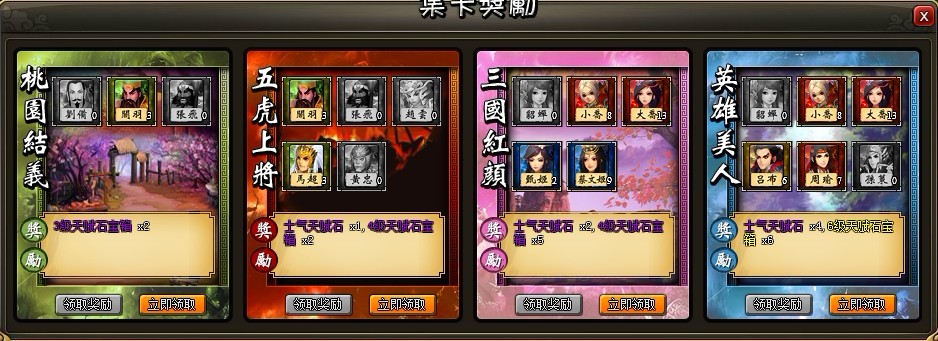 特定的三国名将卡可以组成卡片组合,当收集到某一组合的全部卡片后,就可以领取奖励,在领取奖励时该组合的所有卡片都会消耗一张。剩余的卡片可以出售换取银币。