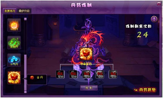9. 炼丹系统新增【夺命金丹】的炼制,需要5种材料各10个,最后1种为玄参,可通过威望兑换商城,消耗1威望兑换