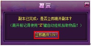 2.优化副本系统中所有怪物死亡后的倒计时提示,调整为弹窗提示,玩家可以点击提示中的【立即离开】按钮提前退出副本,如无操作,倒计时完毕则自动退出副本。