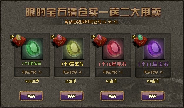 活动时间内,宝石将以优惠的价格倾销大甩卖。