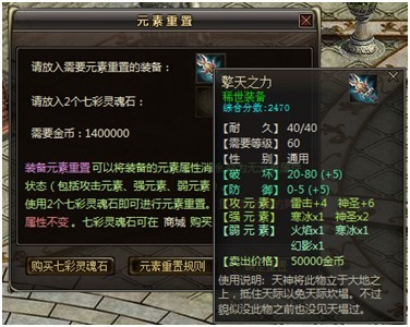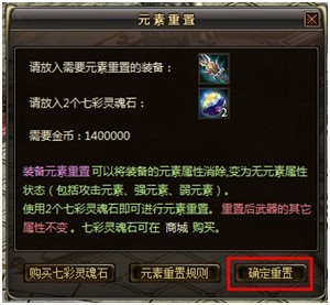 装备元素重置可以将装备的元素属性消除,变为无元素属性状态(包括攻击元素、强元素、弱元素)装备的其他极品属性均不受影响。