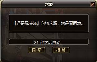 男方发起结婚后女方的界面中弹出一个询问是否同意的提示框。如果女方同意则结婚成功,若女方拒绝,则结婚失败,失败不退还男方的10万金币。
