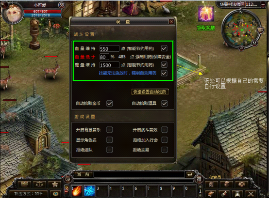 1.点击主界面下面的设置按钮即可打开设置面板,在设置面板里即可进行游戏的基本设置和战斗设置。其中战斗设置就是今天要讲的重点:如何自动加血。