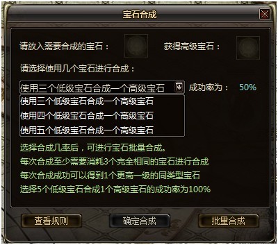 然后再就是宝石合成了,宝石合成的越高级,武器所获得的各项力量就越大。其中低级宝石合成高级宝石的数量和成功率可以选择。