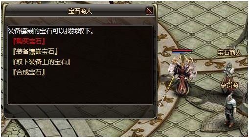 1.首先来到春之城的“宝石商人”处。需要购买宝石,装备镶嵌宝石,取下装备上的宝石,合成宝石的,要在“宝石商人”进行。首先我们需要宝石和有镶嵌孔的装备。