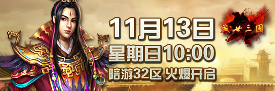 陪游《盛世三国》32区将于11月13日上午10:00震撼开启,与此同时,我们还为各位玩家准备了丰富的活动和好礼,助英雄们驰骋沙场!