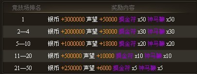 5. 活动描述:擂台争霸,一决雌雄。合服后开启竞技排行争夺活动,在活动结算日时,达到相应的竞技场排名的玩家将能获得排位奖励。